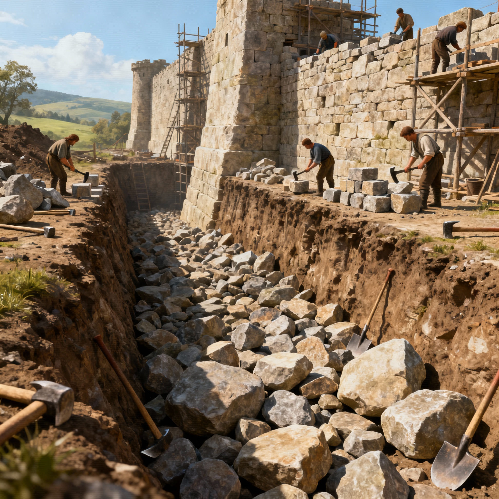 Одна общая черта строителей замков в средневековую эпоху - это то, что они ориентировались на легкодоступные строительные материалы. То же самое относится и к фундаменту.